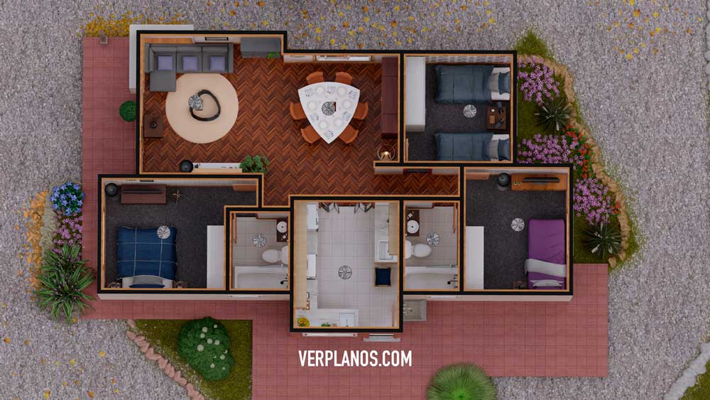 Planos de casa económica y sencilla con 3 dormitorios y 2 baños
