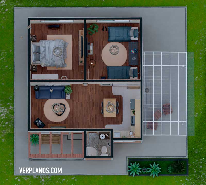Este diseño de plano de casa o idea de plano de casa, es una vivienda pensada para cumplir la función de hogar de una familia de hasta 3 integrantes cómodamente.